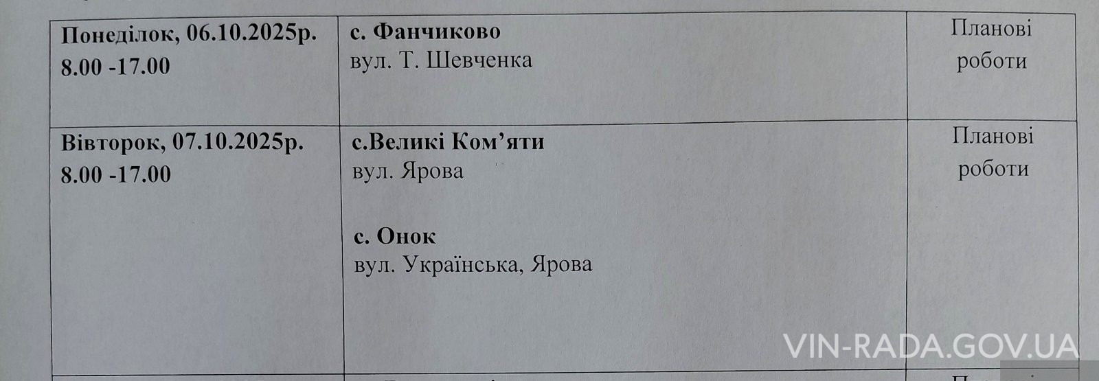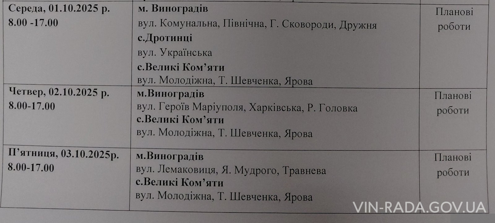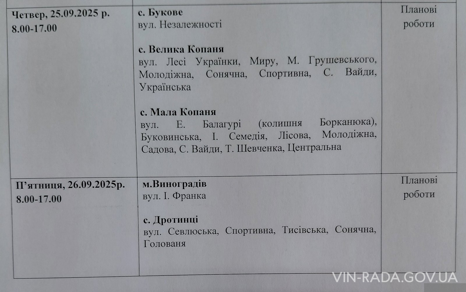 Відновлення газопостачання заплановано 26.09.2025 р. з 09.00.