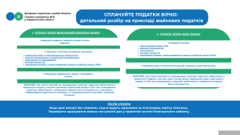 Покрокова інструкція щодо сплати податкових зобов’язань з майнових податків (земельний податок, плата за нерухомість) через мобільні застосунки банків та у касах банківських установ