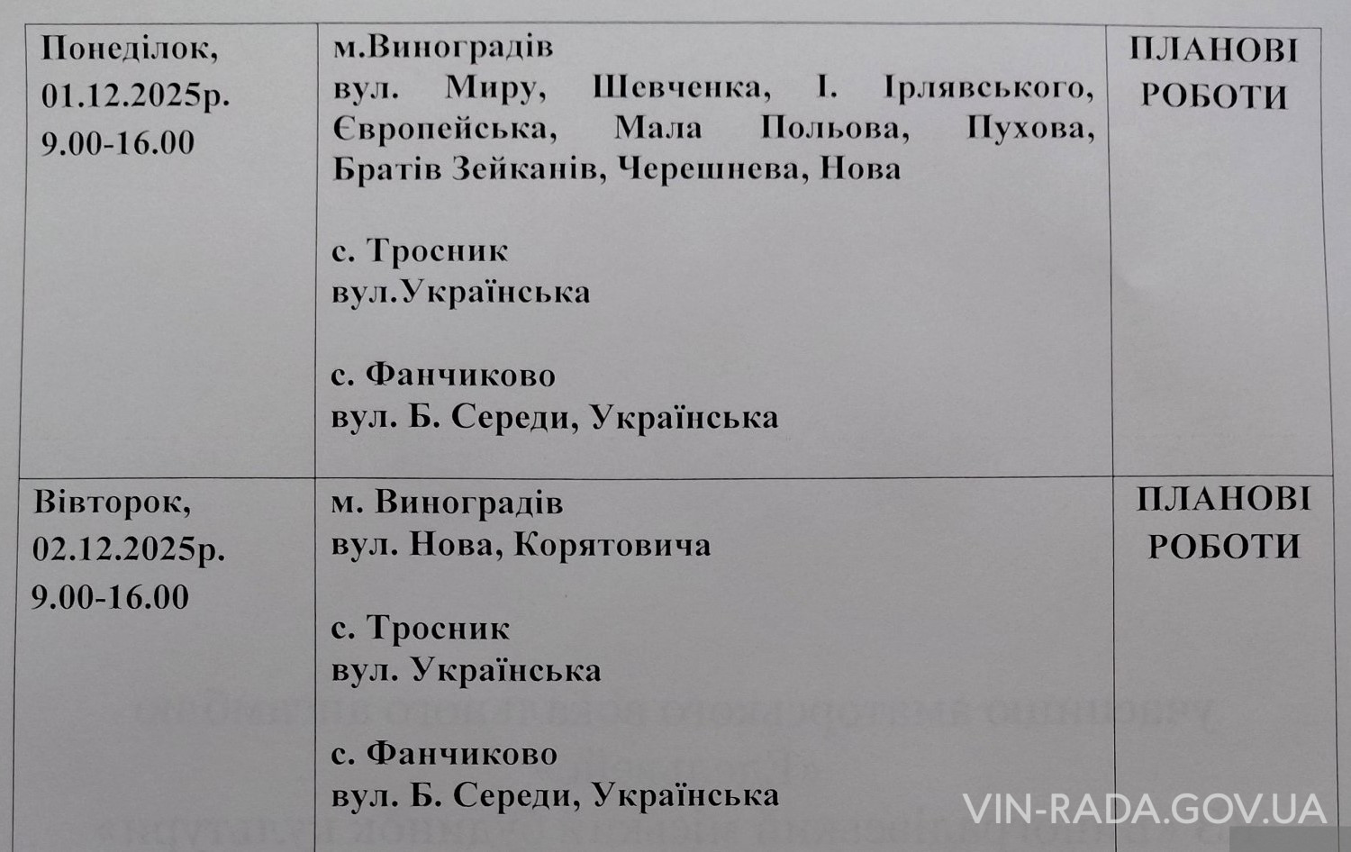 Виноградівська міська рада повідомляє, що завтра, 27 листопада 2025р., заплановане продовження робіт із санітарної та омолоджувальної обрізки дерев по вул.Миру в м.Виноградів (на ділянці від центрального універмагу (ЦУМ) до повороту на вул. Шевченка (в районі магазину «Родинна ковбаска»).